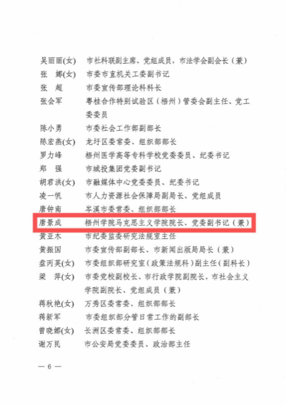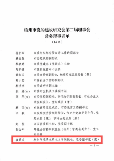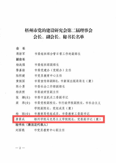 近日,梧州市党的建设研究会公布了第二届理事会成员名单。我院院长唐景成教授成功当选梧州市党的建设研究会第二届理事会副会长。