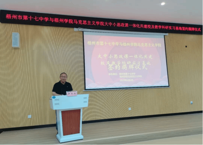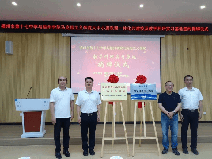 活动分为授牌、座谈两个阶段。在授牌仪式由梧州市第十七中学校长吴锦志主持活动,校党支部书记曾光为活动致辞。尹杰钦院长从大中小学思政课一体化建设的政策、理念等谈了对共建活动的感想。梧州市教育局总督学王剑彪则从大中小学思政课的政治方向谈了教育局未来工作的构思。各位领导发言后,我院与梧州市第十七中在与会嘉宾见证下进行大中小思政课一体化共建校、教学科研实习基地揭牌仪式。