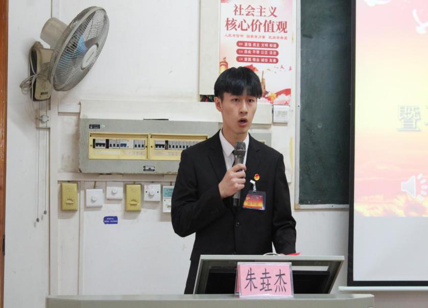 校学生会代表朱垚杰同学致辞,也提醒我们要全面坚持团委的领导,践行社会主义新思想,坚定目标跟党走并增强校级、院级的互通,打造更好的服务平台。