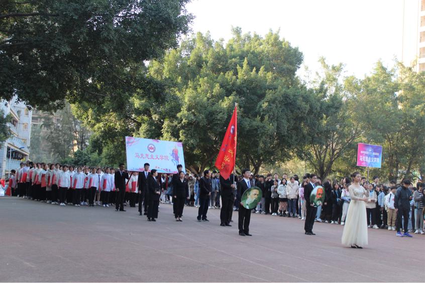 我院方块队迈着整齐有力的步伐,以青春自信的笑容和整齐划一的服装彰显青春昂扬的活力。头阵的几位同学手举写着“马克思主义学院”的院牌和马克思和恩格斯的画像。他们喊着响亮的口号:“审问慎思,笃行致远,马到功成,愿受长缨!”来到主席台前,方块队成员们用红色板块摆成百舸争流的船形、鲲鹏齐态的鱼形,展现出海纳百川的胸怀。舞蹈表演的同学们舞姿轻灵,身轻似燕,曼舞于队列间。