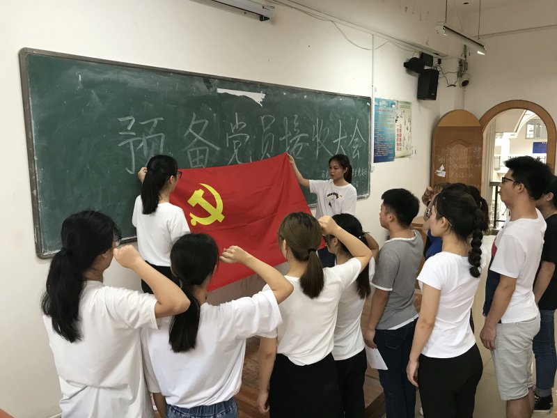 会议严格按照组织发展程序进行。由发展对象杨鑫等8名同学依次宣读入党志愿书,两位入党介绍人和评审员通过平时与各位发展对象的接触与了解,说明情况,发表意见并对其进行党的理论知识提问。采用无记名的投票方式表决,8名同学均以全票通过光荣加入中国共产党。支部书记冼春妮为新党员授予党徽并面对党旗庄严宣誓。
