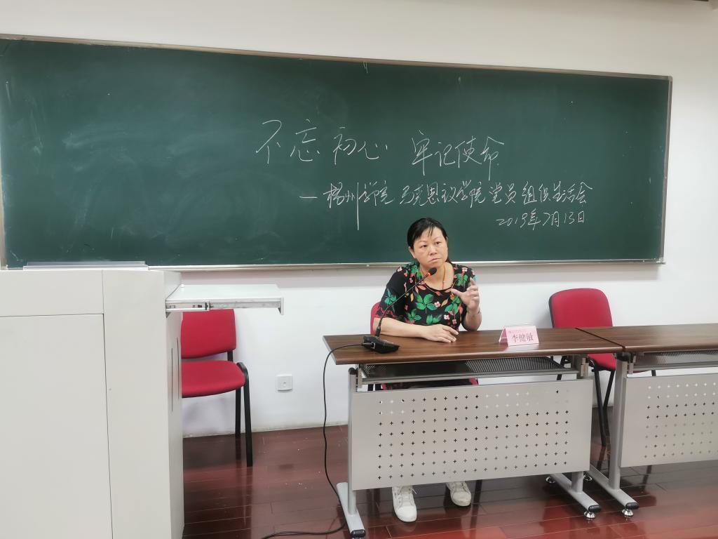 2019年7月13日,马克思主义学院教工党支部利用课程培训时间在百年名校浙江大学华家池畔开展主题为“不忘初心,牢记使命”组织生活会。教工支部书记李健敏讲述了黄文秀同志的先进事迹,动员广大党员积极响应习近平总书记的号召,结合工作实际铭记中国共产党的初心,担当新时代赋予的使命,贯彻落实学校党委工作目标,打好审核评估年和改革年这两场攻坚战,为建党98周年,新中国成立70周年献礼。党总支书记王振宇谈了学习体会。张朝松副院长及部分专兼职思政课教师党员共18人参加了本次活动。