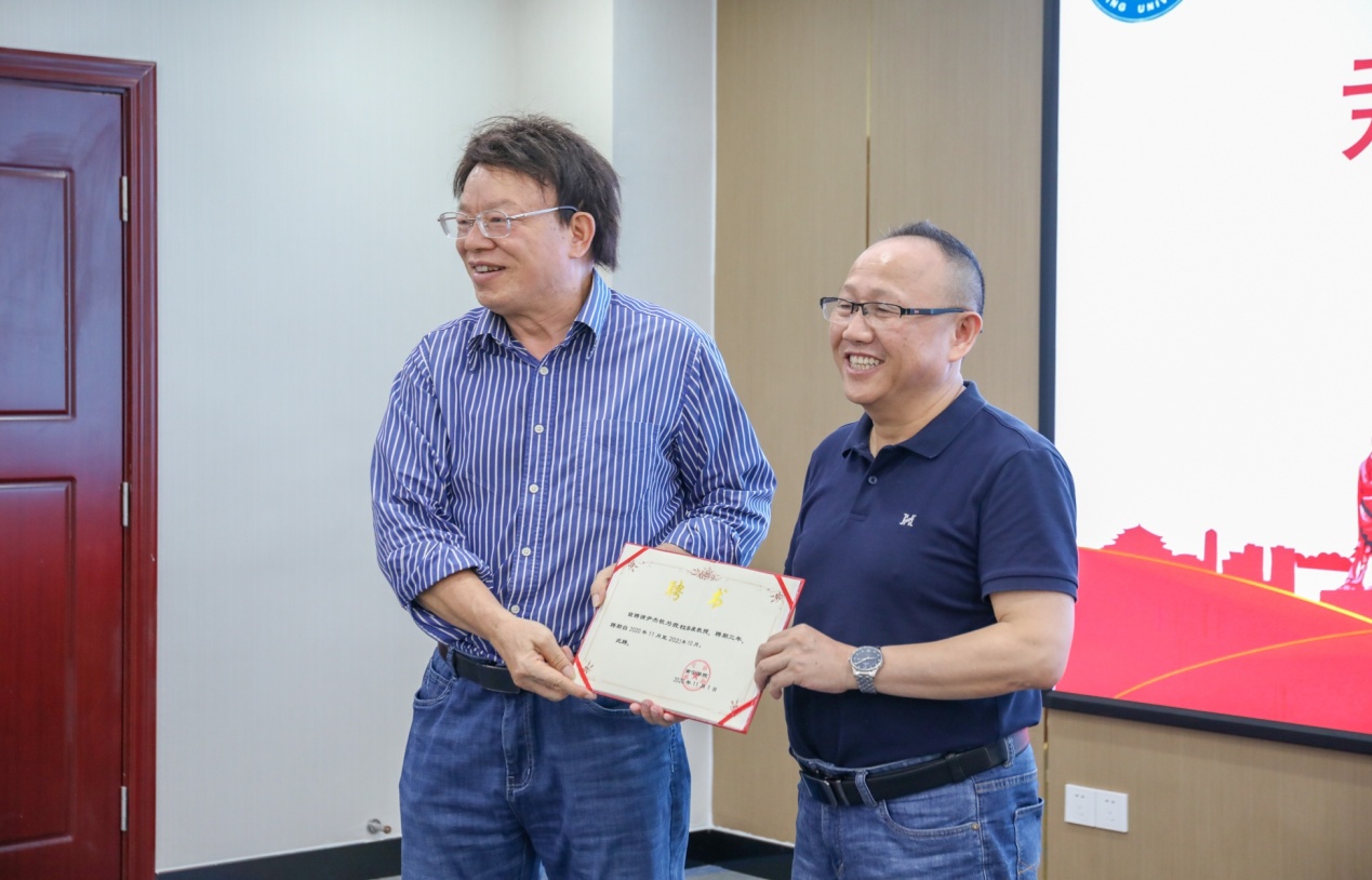 在讲座开始前,按照广西高校集群结对共建的相关要求,南宁学院聘请我院院长、二级教授、博士生导师尹杰钦教授为兼职教授,学校党委副书记覃存民为尹教授颁发了聘书。