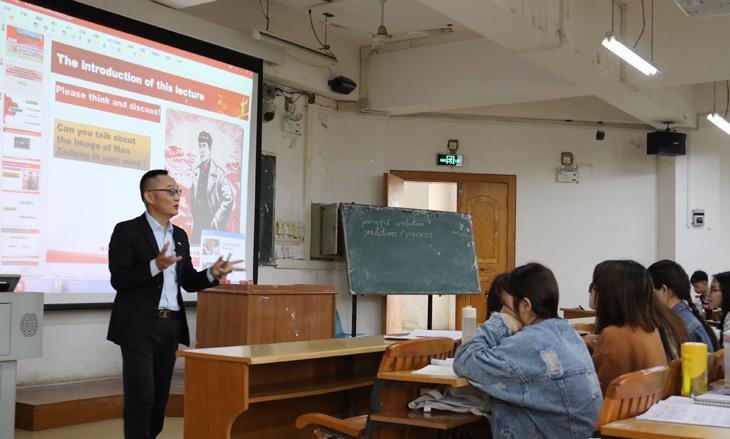“说说你心目中的毛泽东?”“我认为毛泽东有崇高理想并且很有军事才能。”“他的书法独一无二,诗歌也写得很好!”吴昊老师游走在教室中间,并不时地用英语提问,开展互动交流。不少同学主动举手并用英语与老师进行交流。吴昊老师一边点评同学们的回答,一边将课程知识点和盘托出,让大家在既紧张又活跃的课堂氛围中开展学习和探讨。