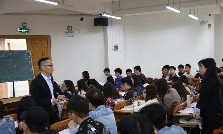 在课间时分,唐平秋书记在教室与同学交流,听取大家谈论思政课双语教学的感受。“我觉得这门课上课形式非常生动有趣,既可以学习思政课理论知识,又可以提高英语学习,我们喜欢这样的课堂!”2017级工商管理1班的黄晨同学说到。当大家被问及喜不喜欢这样的课时,班上绝大多数同学高高地举起了手。