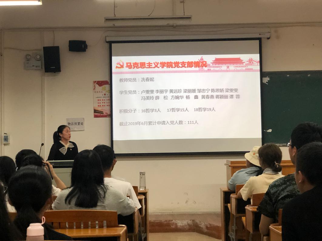 为进一步提高新生对党的认识,9月20日晚上,马克思主义学院学生党支部在明理楼M502举办了“2019级新生党的基本知识普及培训课”。学生党支部书记冼春妮及全体学生党员、2019级哲学班全体同学参加了此次培训课,培训课由学生党员杨鑫主持。
