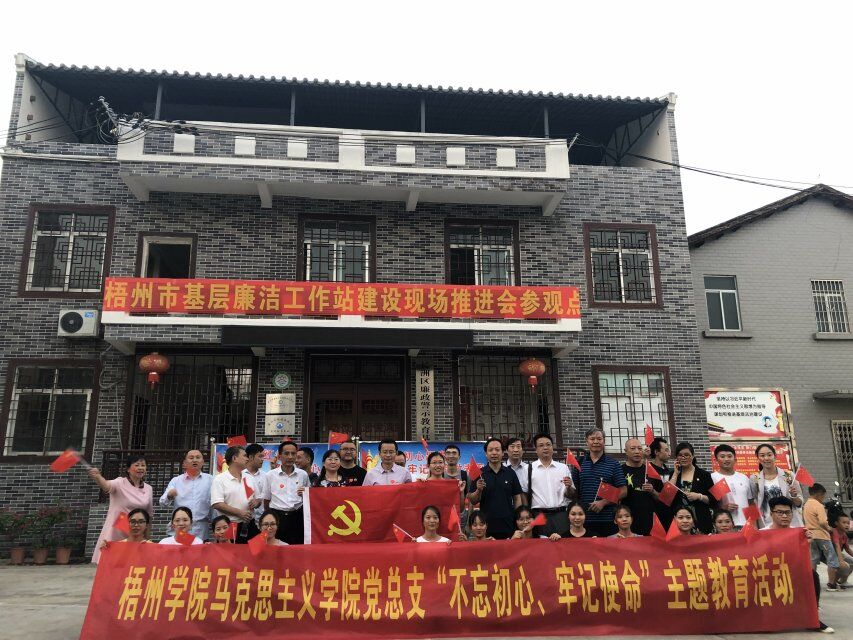 2019年9月25日下午,马克思主义学院党总支全体党员在长洲区泗洲村廉政文化教育基地开展“不忘初心、牢记使命”主题教育活动——党员活动日。党员们先参观了廉政文化教育基地纪念馆。接着,启动“不忘初心,牢记使命”主题教育活动。党总支书记王振宇首先传达中共梧州学院党委关于开展“不忘初心,牢记使命”主题教育活动通知,宣布马克思主义学院主题教育工作领导小组方案,马克思主义学院“不忘初心,牢记使命”主题教育活动正式启动。接着,王振宇宣读了中共梧州市纪委对两起违纪案件的通报,强调十一长假全体党员同志抓好“四风”,落实好中央八项规定精神。