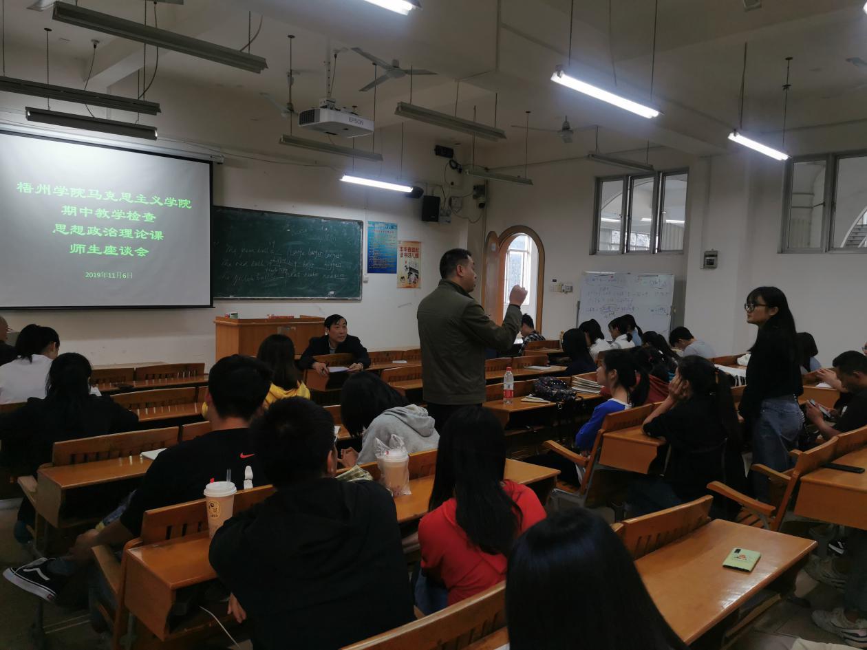 2019年11月6日下午16时,为了更好地了解思想政治理论课的教学情况,进一步增强思政课教师的教学水平,马克思主义学院在明理楼M201教室召开了思想政治理论课座谈会。座谈会由白移、黄康庆及朱正西三位教师主持,各二级学院18级、19级的学生代表参加了座谈会。