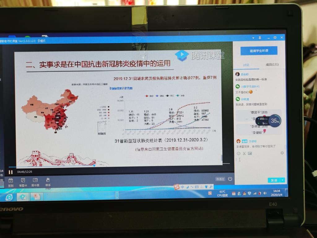 根据教育部疫情期间停课不停学的通知精神,马克思主义学院教师通过Q群、腾讯课堂、对分易课堂等网上直播平台,开展教学活动。《毛泽东思想与中国特色社会主义理论体系概论》教研室要求教师结合抗疫形势,引导学生领会党中央关于防控新冠肺炎的最新精神,正确认识实事求是思想路线在抗疫过程中的运用,讲社会主义制度好,共产党好的故事。据统计,开通在线直播课党员教师占1/3,利用教育部优质课程资源在线辅导党员教师占2/3。
