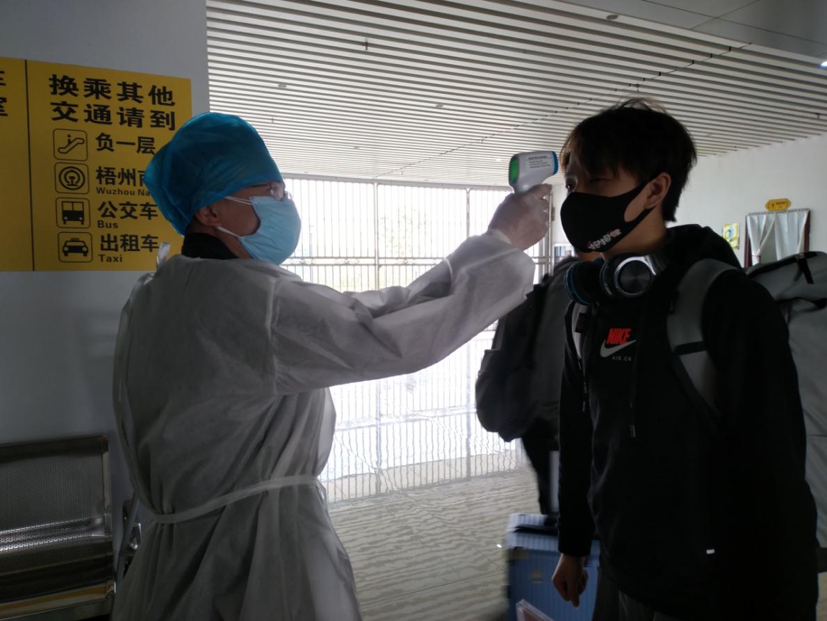 2月26日 王振宇在梧州南站客运枢纽站为出站人员检测体温