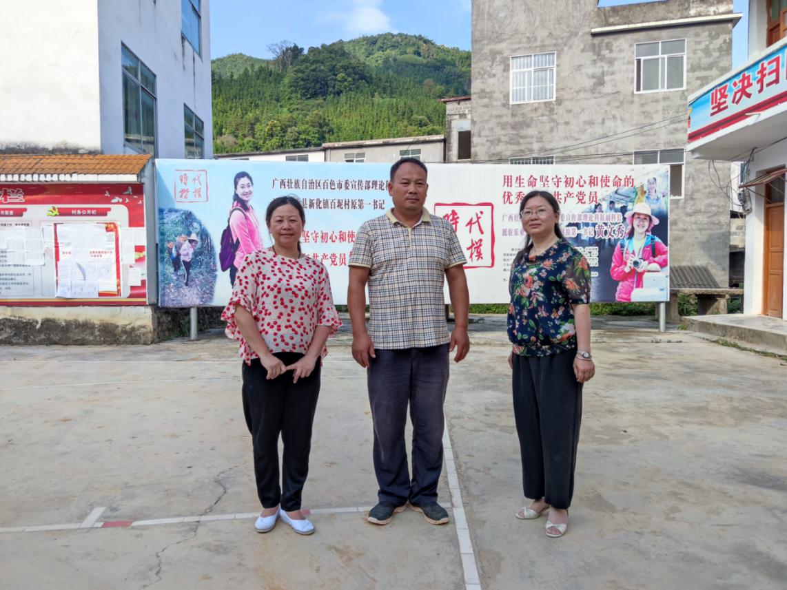李健敏、朱红晖与百坭村支部书记周昌战(中)在村委办公地点合影