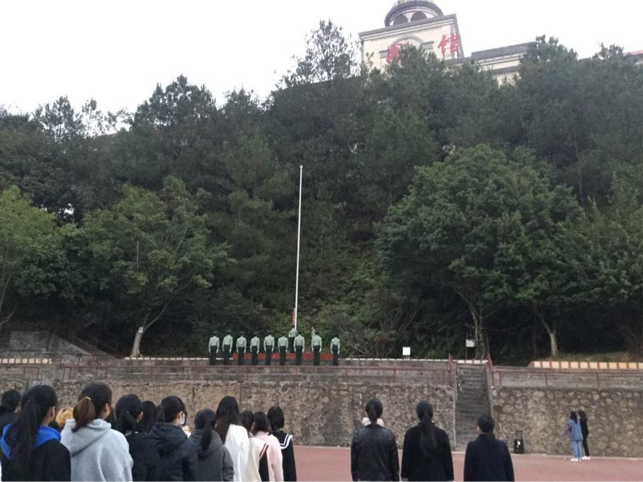 七点整,升国旗仪式正式开始,国旗护卫队踏着整齐的步伐护送国旗入场。在庄严的国歌声中,同学们肃立行注目礼,鲜艳的五星红旗冉冉升起,燃起了同学们心中的爱国热情与对未来的美好憧憬。随后,外国语学院19级翻译2班学生代表吴心梅在国旗下发表“崭新蓝图,勇挑重任”为主题的讲话,分享自己学习党的十九届五中全会精神后的三点心得体会与大家共勉,一是要有坚定信心,勇往直前;二是要有开放心态,面向世界;三是要有责任与担当,勇挑重任。号召我们努力学习,增长才干,为全面建设社会主义现代化国家贡献自己的青春力量。