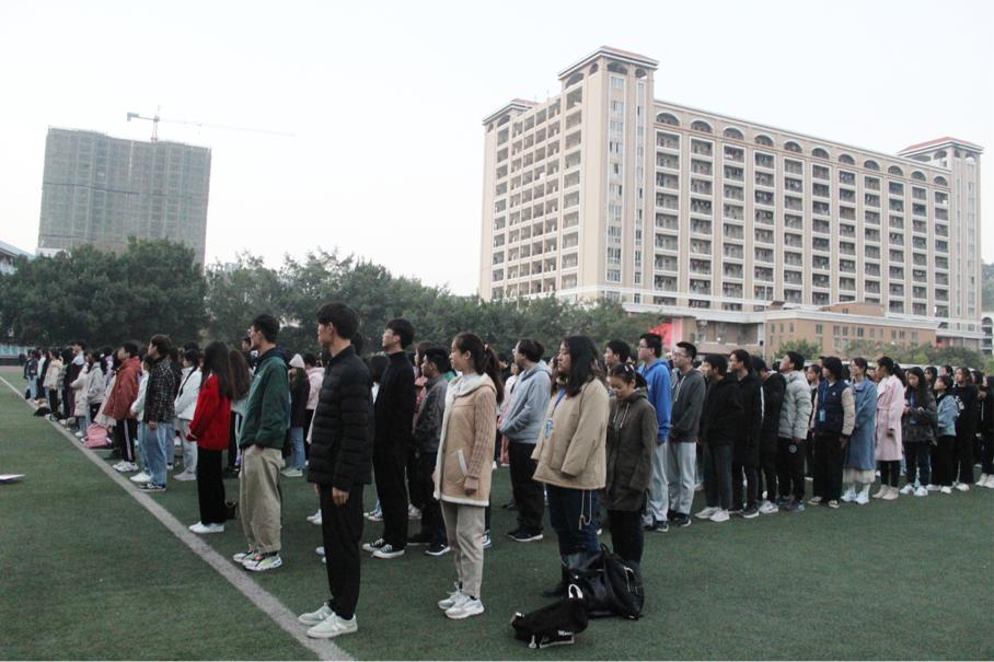 11月30日清晨,天色渐晓,晨光透过薄雾,在朦胧而静谧的足球场上,马克思主义学院和外国语学院共同举行了第十三周的升旗仪式。两院的学生以饱满的精神状态在足球场集合参加本次的升旗仪式,给梧院的清晨带来了勃勃生机。参与此次升旗仪式的有马克思学院党总支副书记龙文秋老师、团委书记冼春妮老师以及外国语学院党总支副书记庄雨老师、梁眉老师。