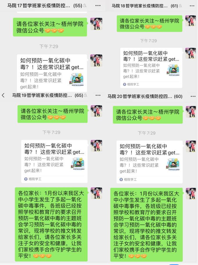 为进一步预防与减少学生一氧化碳中毒事件发生,保障学生生命安全,马院于1月28日-30日间在全院学生范围内利用“学习和预防一氧化碳中毒”网络主题班会、微信公众号推文、班级QQ群,学生家长群等多渠道开展多形式宣传教育。通过播放视频短片、抖音、推送防范信息等方式,让学生及家长了解风险隐患点,进一步地提升了同学们的自我保护意识,提高了应急、自救与保护的能力,并掌握安全防范措施。
