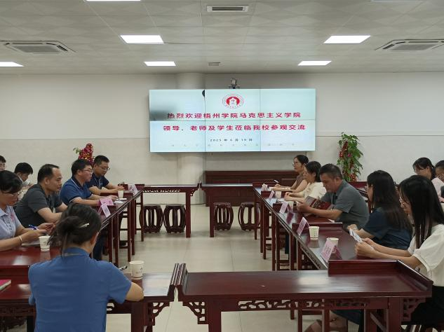 在梧州市黄埔双语实验学校,李其斌校长介绍双语实验学校的基本情况,唐景成院长介绍了学校、学院的办学优势、思想政治教育专业课程、毕业生就业等方面的情况。随后,双方就毕业生素质能力要求、实习实践、人才培养、校地协同育人等方面展开了深入探讨,李校长结合学校实际提出用人需求,希望进一步加强合作。