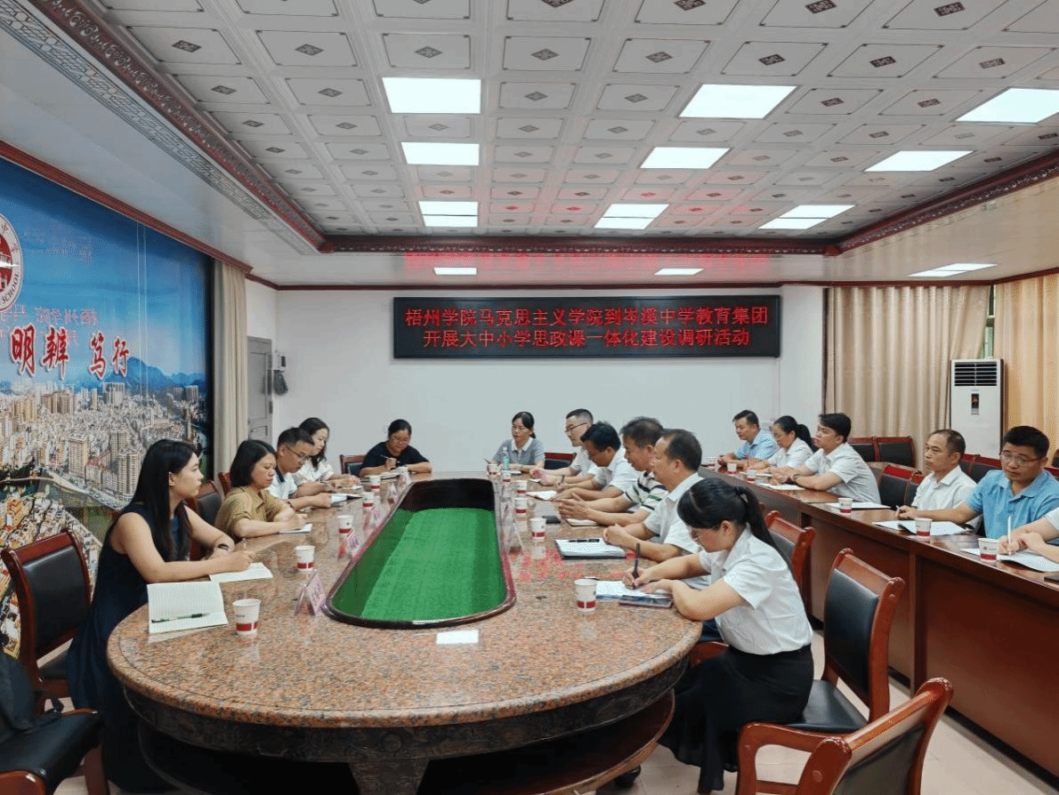 同日下午,调研组前往岑溪中学教育集团进行实地调研与研讨。岑溪市教科所所长莫英松、岑溪中学校长黄斌等参与了调研。岑溪中学介绍了其在集团化办学中推进思政课一体化的实践与成效,市教科所所长莫英松重点推介了“义江擎红 天龙承孝”本土思政品牌。冀宁书记表示,学院将强化联动,共同探索育人新范式。