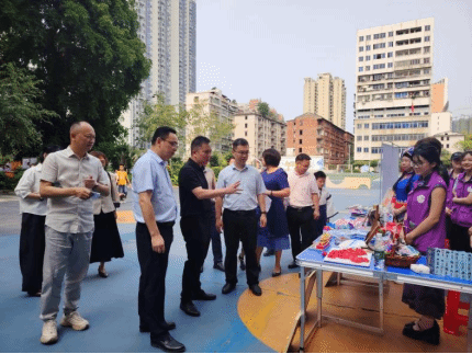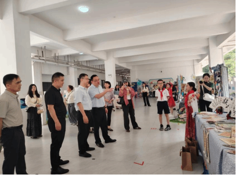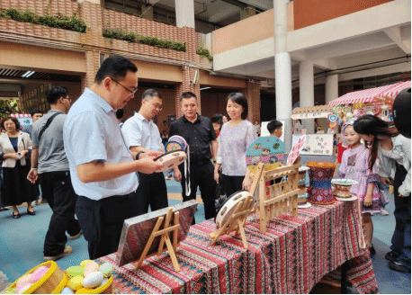 启动仪式后,唐景成与各位领导与嘉宾来到学校操场,参观了学院实践教学成果展和铸牢中华民族共同体意识课程实践作品展。学院以多元艺术形式生动诠释了“中华民族一家亲”的深刻内涵,吸引了领导嘉宾、中小学师生驻足观赏,也获得了广泛好评。随后,领导嘉宾走到中小学、幼儿园展示摊位前,沉浸式体验民族手工艺、非遗技艺展演、跨学科民俗实践成果、非遗美食制作。