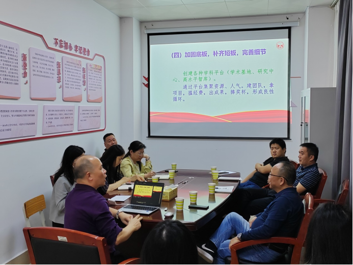 黄山松教授首先从“把握学科发展大势,满怀申硕憧憬”着手,指出马克思主义理论当前发展前景光明,马克思主义学院同仁要坚定信心,矢志不移走好申硕道路,认真踏实做好申硕准备。他结合广西科技大学马克思主义学院申请马克思主义理论一级学科硕士学位授权点的具体过程,详细介绍了硕士学位授权点申请的基本条件,并讲述了在申硕过程中的几点体会。谈及申硕期间的困难准备,黄教授鼓励我院要树立决心、保持恒心,学深悟透申报条件和要求,把握重中之重,同时也要加固底板,补齐短板,完善细节。最后,黄教授就申硕过程中所遭遇的难点和痛点与在座教师展开了热切的交流。