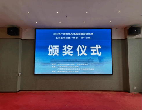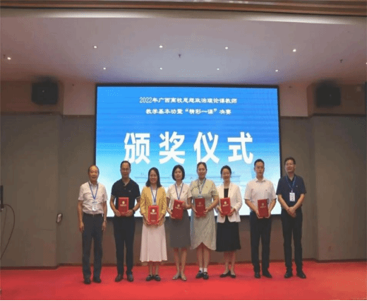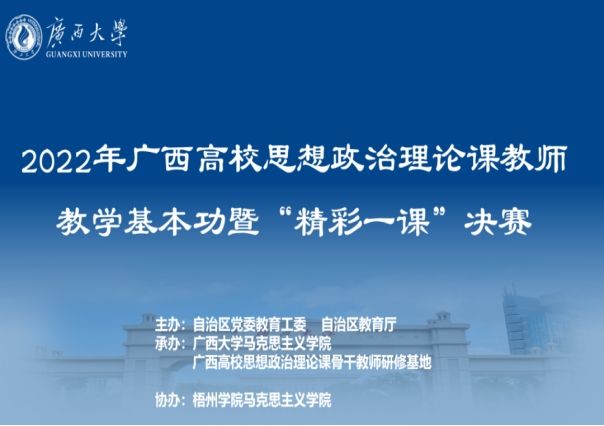 在党的二十大即将召开之际,9月24日,由自治区党委教育工委、自治区教育厅主办,广西大学马克思主义学院、广西高校思想政治理论课骨干教师研修基地(广西大学)承办,梧州学院马克思主义学院协办的2022年广西高校思想政治理论课教师教学基本功暨“精彩一课”决赛在南宁顺利举行。本次比赛通过“以赛促教、以赛促学、以赛促升”的方式,深入挖掘和探讨教学中的重点难点问题,着力提高中青年思政骨干教师的专业素质,不断增强他们把道理讲深讲透讲活的能力,进一步提升思政课的历史厚度、理论深度、视野广度、情感温度和价值高度,让思政课在释放“真理的味道”的同时增强生动性和亲和力,成为 “有意思”“有营养”的思想盛宴。
